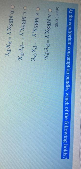 MRS XY -P Y P X. The equilibrium consumption bundle is a. At the equilibrium consumption bundle which of the following holds.